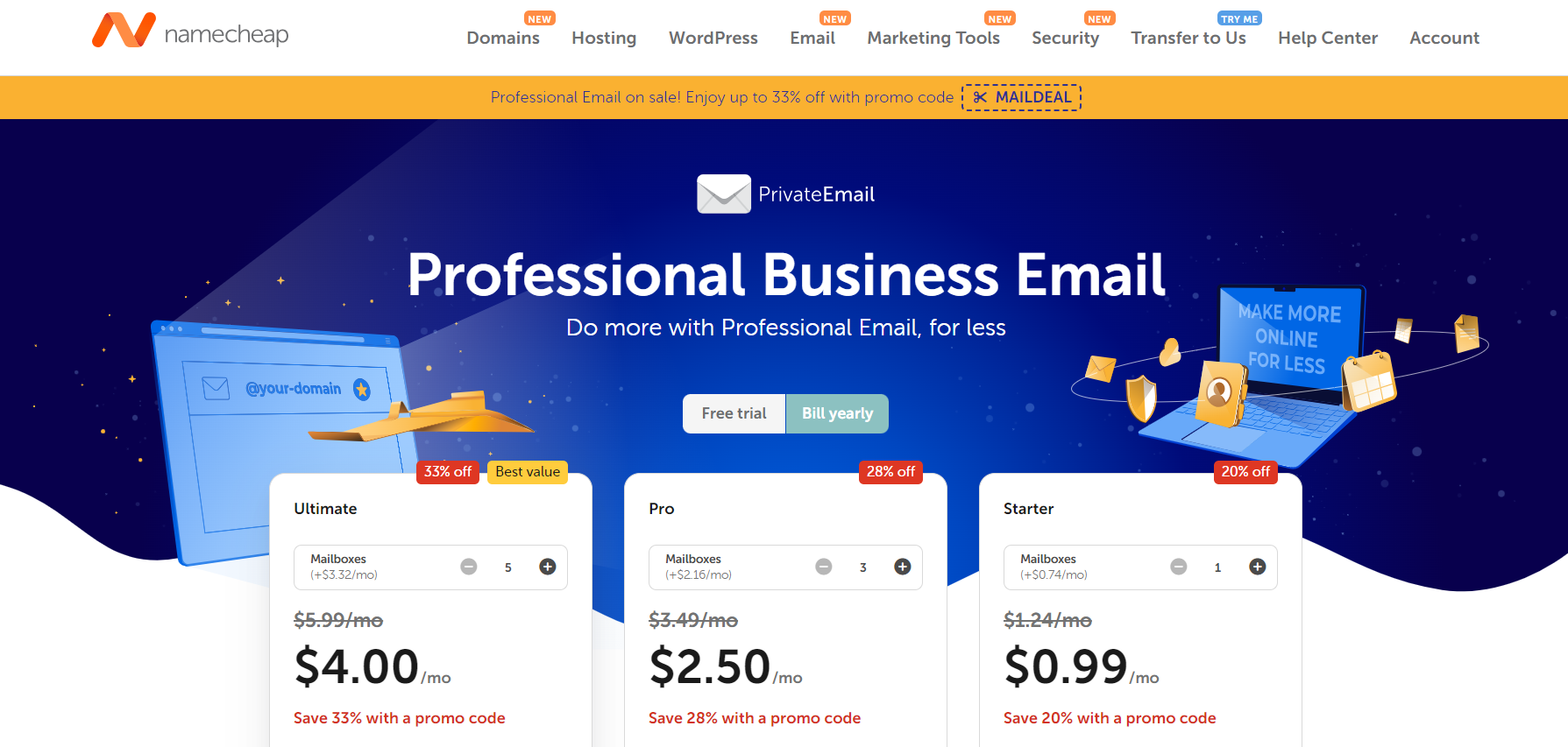 - Go to the Namecheap website and choose an email hosting plan.